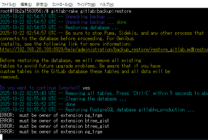 拡張機能の「pg_trgm」「btree_gist」について、所有権が必要と言う事でしょうか。一通り調べましたが本エラーを解決する方法は見つからず。GitLabは内部でPostgreSQLを使用しているようですが、テキスト検索時、高速類似度検索を行う為の拡張機能のようです。元のGitLabでもそのような拡張設定はしていなかったので、無視する事としました。